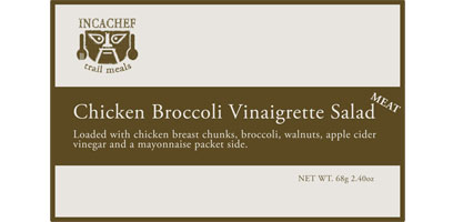 Chicken breast chunks with broccoli, walnuts, apple cider vinegar and a mayonnaise packet side.